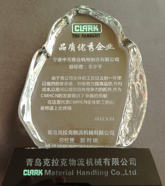 在本月召開(kāi)的青島克拉克物流機(jī)械有限公司供應(yīng)商會(huì)議中,中天公司在30多家供應(yīng)商中憑借優(yōu)秀的質(zhì)量、成本及交貨率被評(píng)為品質(zhì)優(yōu)秀企業(yè)。此次會(huì)議共設(shè)兩名優(yōu)秀供應(yīng)商,中天公司為獲得此殊榮的兩家企業(yè)之一。